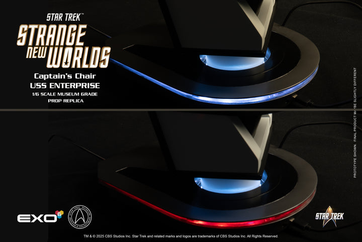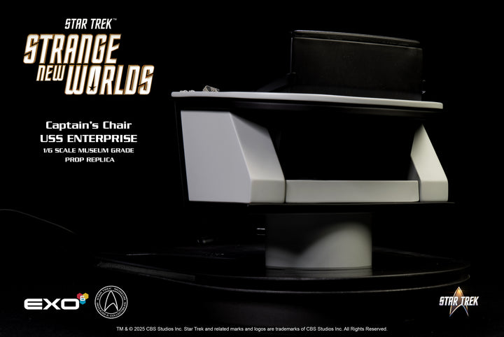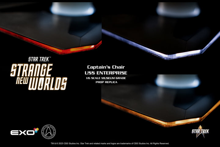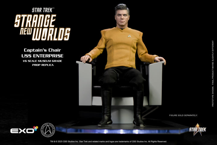 Take command of the bridge with the EXO-6 1/6 scale replica of the iconic Captain's Chair from Star Trek: Strange New Worlds. This meticulously detailed collectible brings a piece of the U.S.S. Enterprise directly to your display, engineered with absolute authenticity. Every contour is faithfully recreated from the show, capturing the sleek, modern re-design of Starfleet's flagship. This chair features a large illuminated platform that transforms the chair into a true centerpiece. Bigger and bolder than any previous EXO-6 release, this display instantly becomes the flagship of your Star Trek showcase.
