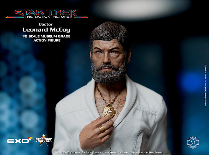 This 1:6-scale figure re-creates this iconic character in exquisite 1:6 detail. Standing approximately 12 inches tall, every element is authentically reproduced with an open necked one-piece suit revealing the good doctor’s ample chest hair. His hands feature sculpted on rings that he wore as accessories for his arrival on the Enterprise. The original portrait sculpt of DeForest Kelley captures the bearded McCoy at his disgruntled best.